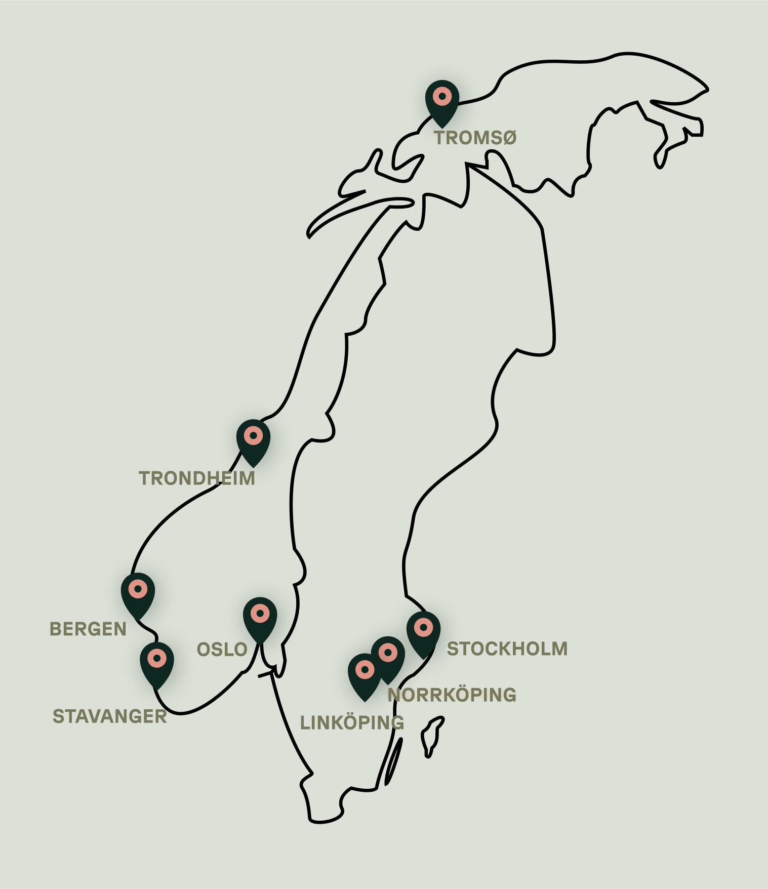In Oslo, Stockholm, Bergen, Stavanger, Trondheim, Tromsø, Linköping, and Norrköping.