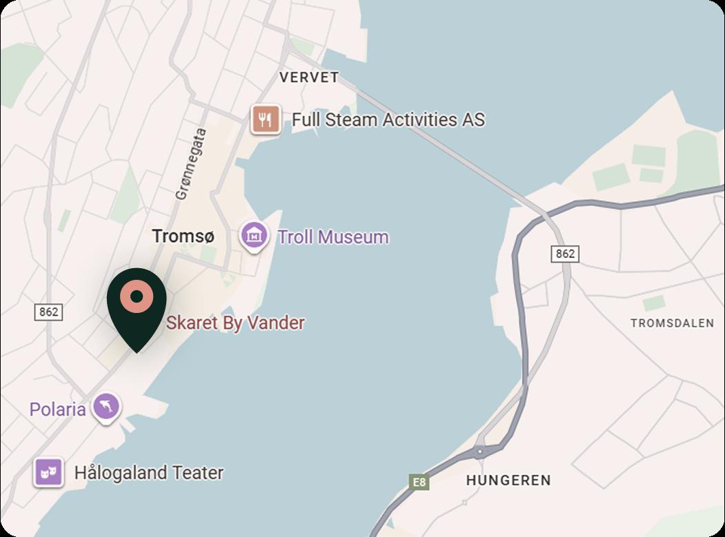 Skaret by Vander is perfectly located in the heart of Tromsø. Just a short walk from the city’s main attractions, restaurants, and the waterfront, our apartments offer the ideal base to experience the Arctic capital.