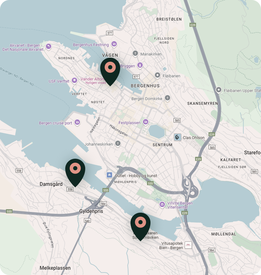 Våre 152 leiligheter ligger i Bergens mest attraktive og sentrale områder – alle innen kort avstand fra kollektivtransport, supermarkeder, kafeer og restauranter.