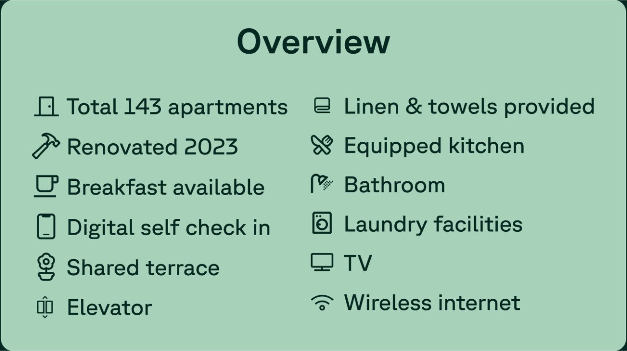 Our newly renovated aparthotel features 143 stylish apartments and an on-site restaurant serving breakfast, lunch, and dinner. With two metro stations just steps away, you can reach Stockholm’s city center in just a few minutes.