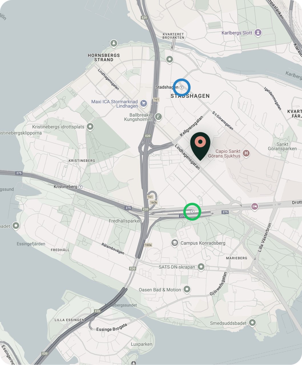 Take the Green line to Thorildsplan and follow the signs to Thorildsplans Gymnasium. Walk 400 meters towards Lindhagensgatan and you have arrived!