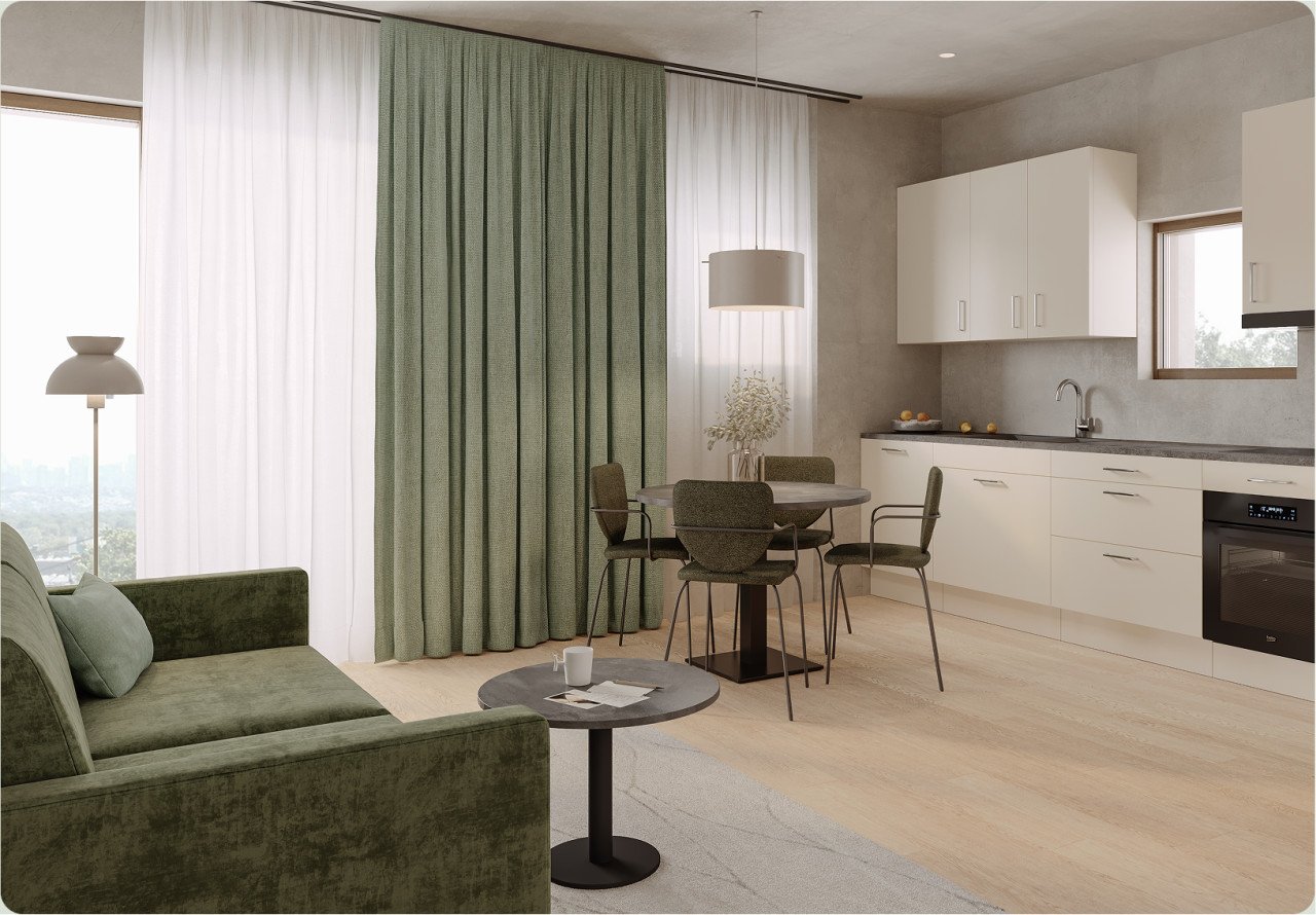 När du bor hos oss kan du förvänta dig fullt möblerade och utrustade lägenheter med höghastighets-Wifi, TV och allt inkluderat i hyran. Genom att designa våra egna möbler utnyttjar vi varje kvadratmeter på bästa sätt. Våra lägenheter är noggrant planerade för optimal yteffektivitet, inspirerade av den stillhet som präglar den vackra skandinaviska naturen.